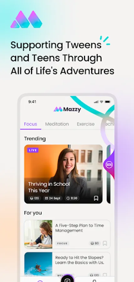 Mazzy provides 1:1 coaching with a licensed therapist, live and on-demand classes on topics of interest, and a professionally moderated community to discuss relevant topics for 10-18 year olds.