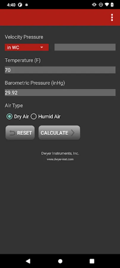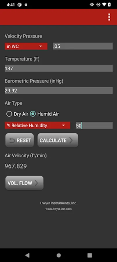 The Dwyer Air Velocity Calculator makes spot checking with Dwyer Pitot Tubes quick and easy. Calculates air velocity and flow from a variety of inputs, and supports both US and Metric units