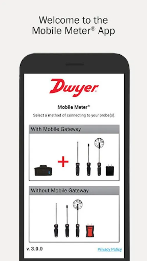 Dwyer Instruments, Inc. HVAC Mobile Meter™ is for use with Dwyer Instruments test instrumentation.
