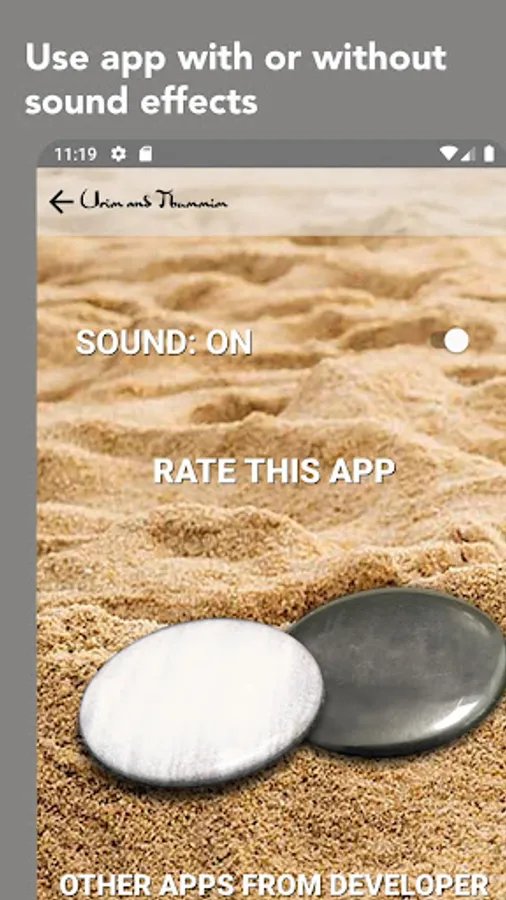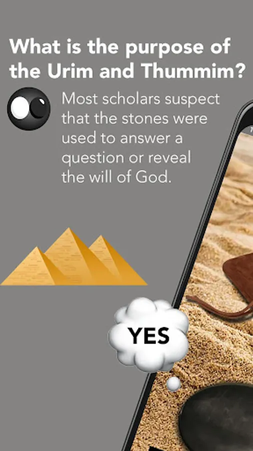 If you have a question, turn to Urim and Thummim for guidance. Simply tap the screen to reveal an answer to your most troubling queries. As described in the heralded novel “The Alchemist” by Paulo Coelho, an old king gave these mystic stones to a young shepherd and instructed him that when an objective question is asked, God will reply using the black stone for "yes" and the white stone for "no". Try them for yourself!