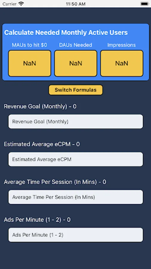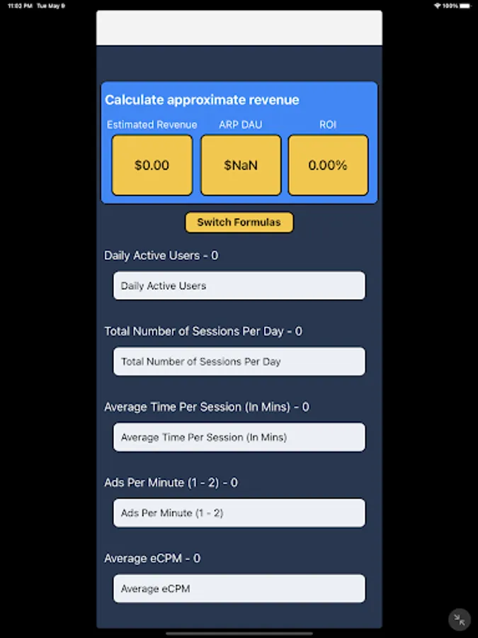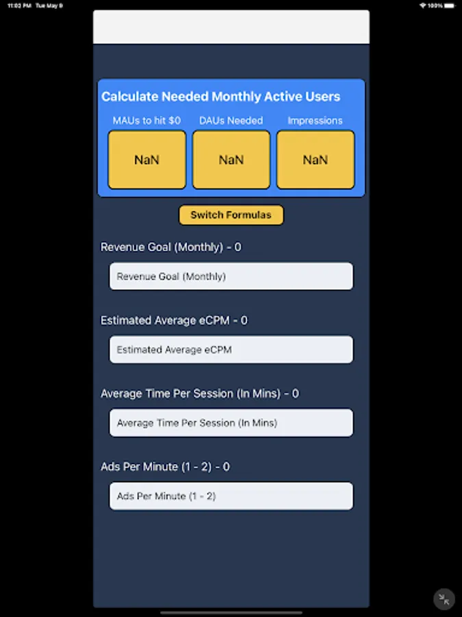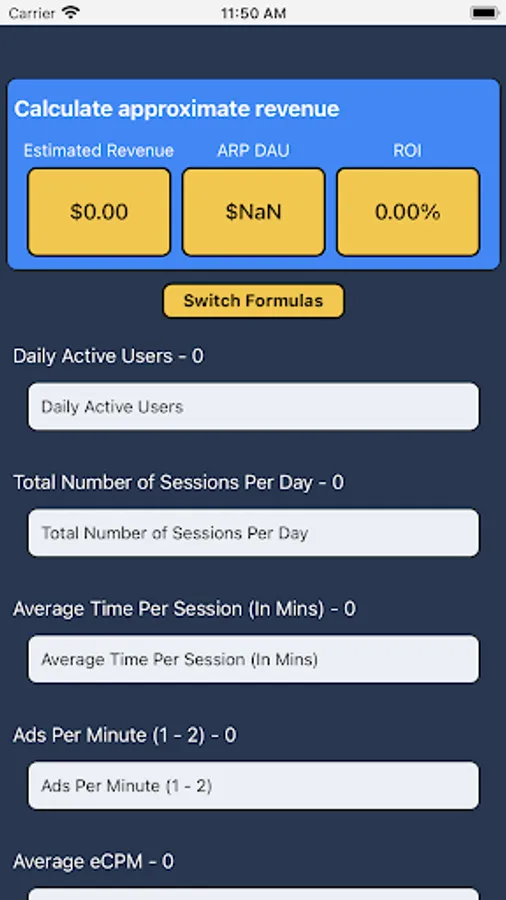 Ad Revenue Calculator is an easy-to-use revenue calculator for your apps and websites that utilize services like Google's Admob for revenue. Need to forecast your expected earnings? Simply fill in the fields and see what you can expect to earn! Want to know how many users you need to make a certain amount of revenue each month? Our app can help you there as well!