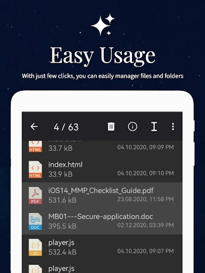 Furthermore, File Manager aids in optimizing your device's internal storage by compressing files and folders, thereby freeing up valuable space. This modern media file organizer supports swift browsing of root files, SD cards, and USB devices. It also supports various file formats, including music, videos, images, and documents.