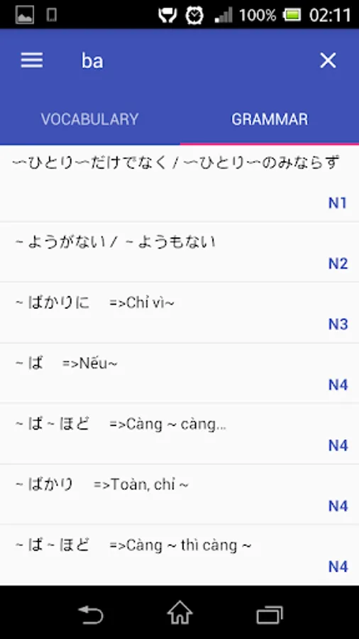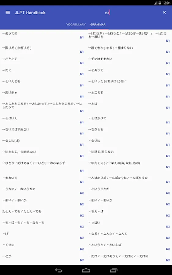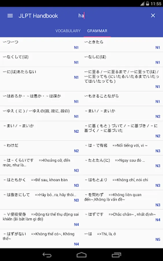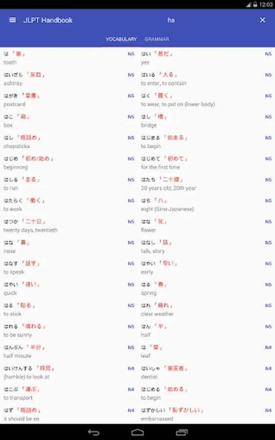 ★ JLPT Handbook is a application for search vocabulary or grammar of JLPT examination (N5, N4, N3, N2, N1).