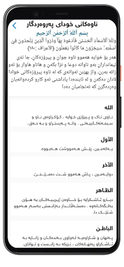 2- ناوەکانی خودای پەروەردگار : ئەم تایبەتمەندییە پێکدێت لە بەشێک لە ناوەکانی خودا لەگەڵ واتاکانی بە کوردی.