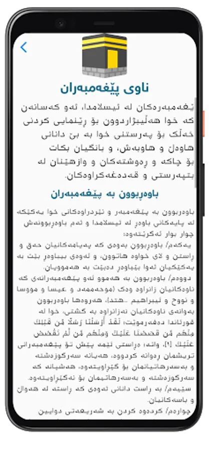 6- پایەکانی باوەڕ : ئەم تایبەتمەندییە پێکدێت لە باسکردنی ٦ پایەکەی باوەڕ لە ئاینی ئیسلام دا.