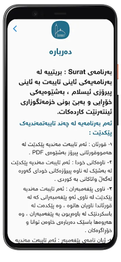ئەپلیکەیشی Surat ئەپڵییکەیشنێکی ئاینی یە تایبەت بە ئاینی ئیسلام ، بەشێوەیەکی خۆڕای و بە بێ بونی هێڵی ئینتەرنێت کار دەکات.