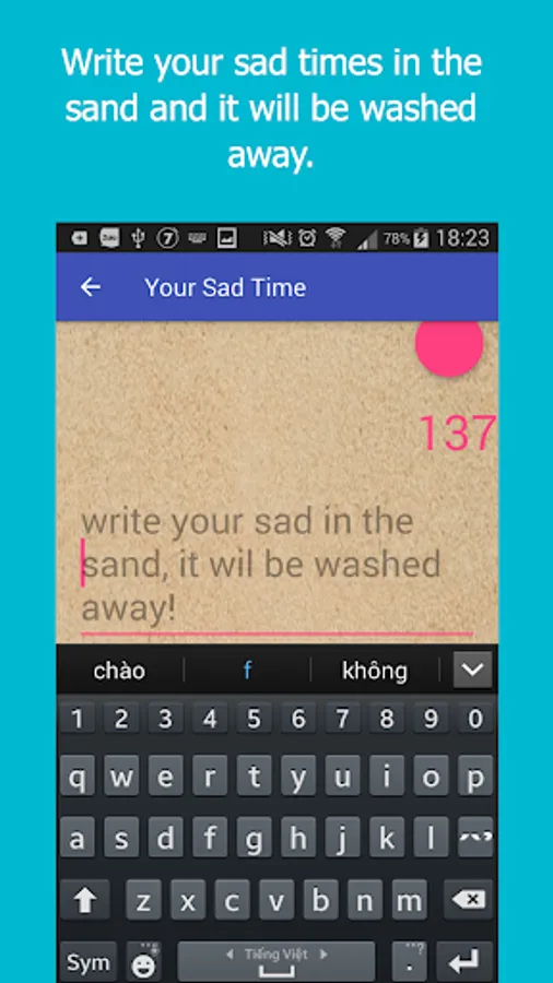 I had an idea about getting over sadness, which is based on the quote: "Write your sad time in the sand, write your happy times in stone", George Bernard Shaw. I hope this app will help you wash away your sad times and feel better.