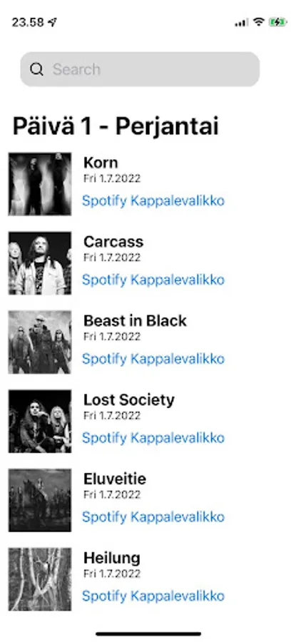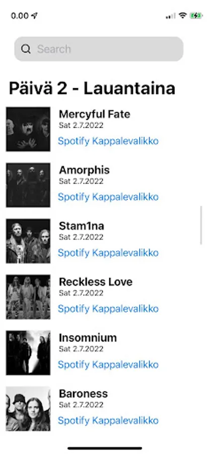 Displays lineup of Tuska 2022 including dates, times and locations of gigs as well as the expected set list from setlist.fm in the form of a Spotify playlist or plaintext.