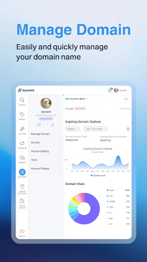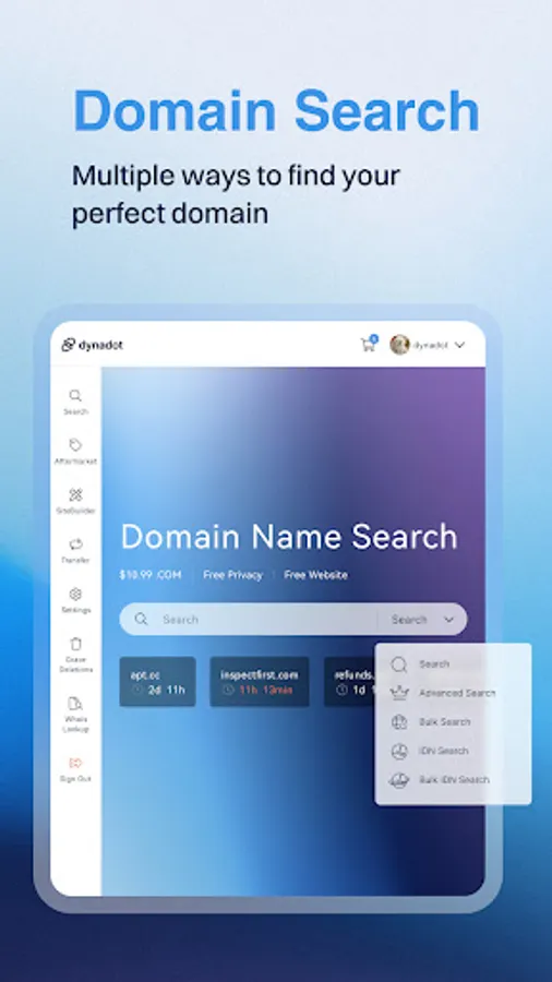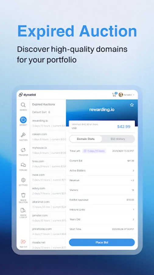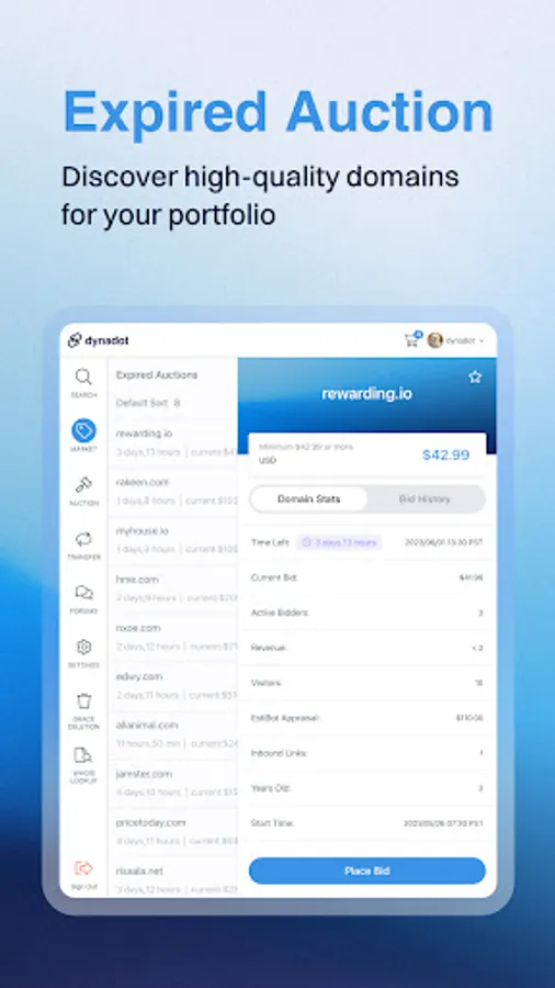 With the Dynadot tablet app, you can explore, place bids, and monitor domains from our domain aftermarket directly from your tablet devices. All of our staple aftermarket listings are here, such as expired auctions, domain backorders, and user auctions. Now's the time to start discovering valuable domains while on the go.