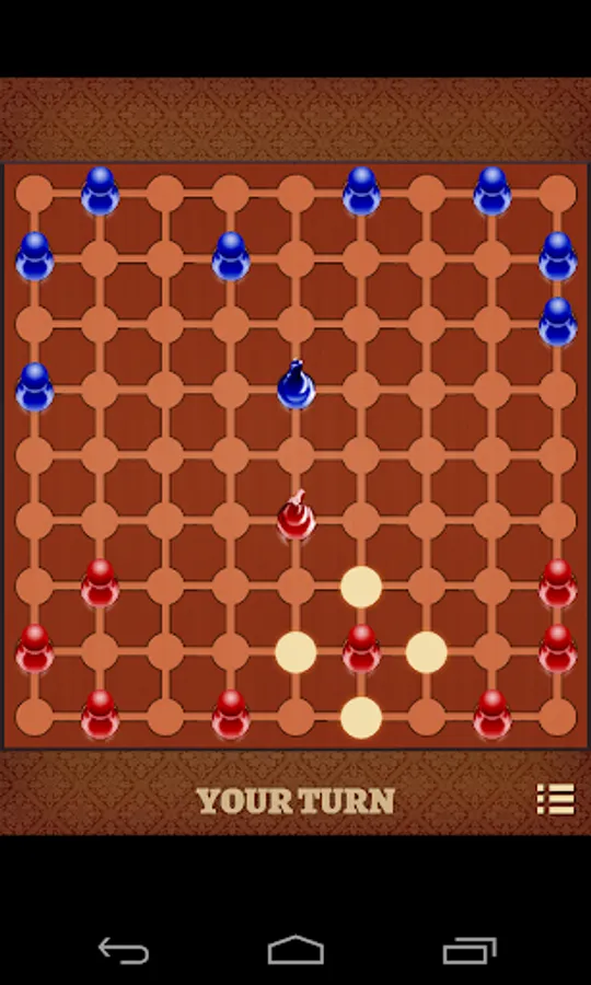 The rules are simple: Eliminate your competitor’s units by surrounding them. The player with the red units begins the game. Players alternate turns by moving units horizontally or vertically. Soldiers can move by one step while riders can move by two. A unit is captured when it is surrounded by two enemy units. The first player to capture enemies down to less than 3 units wins the game.