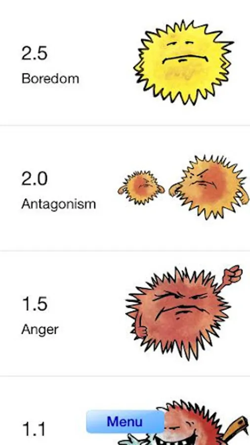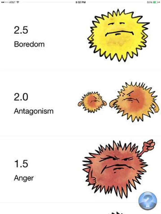 - Ten different emotions/attitudes: Apathy, Grief, Fear, Covert Hostility, Anger, Antagonism, Boredom, Conservatism, Cheerful and Enthusiasm.