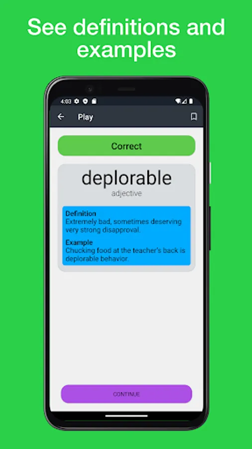 Knowing a synonym serves as a trigger word in your memory to help you remember the general meaning of each word - this makes it easier to remember the definitions and examples you’ve seen in our app when you see or hear a word.