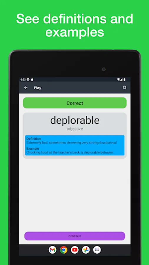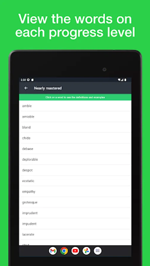 When you learn new words using our vocabulary game, which tests you and helps you strengthen your weak areas, you are going to progress much faster than if you were just reading definitions and examples. There has never been an easier way to expand vocabulary!