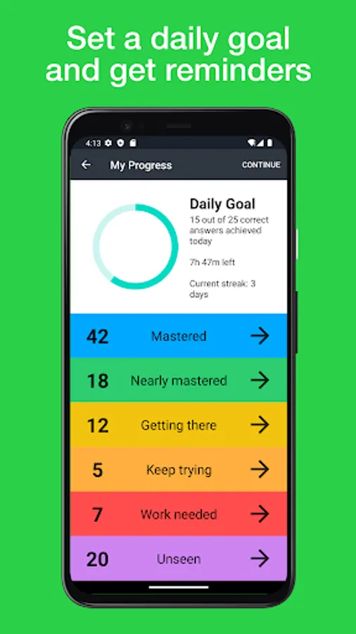 - Set a daily goal to help keep you on track and set up notification reminders for specific times of the day, allowing you to improve your vocabulary every day and learn new words rapidly through spaced repetition