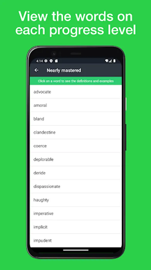 The simple, clean interface allows you to concentrate on learning and progressing swiftly, without any annoying distractions. Our vocabulary builder app uses a special algorithm based on the scientifically proven approach of spaced repetition to determine which words you aren’t so confident with, allowing it to prioritise the order in which words are served. This allows you to quickly learn new words and expand your English vocabulary while also reinforcing the meaning of words that you already knew.