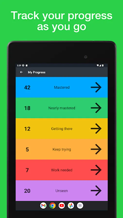 - Access your progress at any time to get a feel for how you’re doing; get regular updates of your progress while learning to show how you are improving your vocab