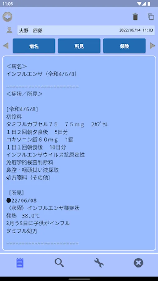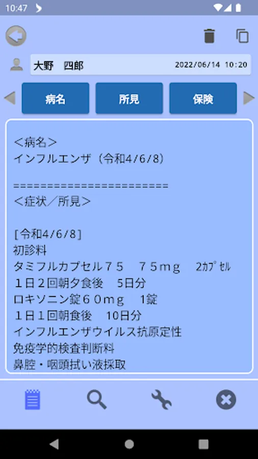 3) Displays medical care details (medical history, findings, insurance information, summary, etc.) for each patient in chronological order