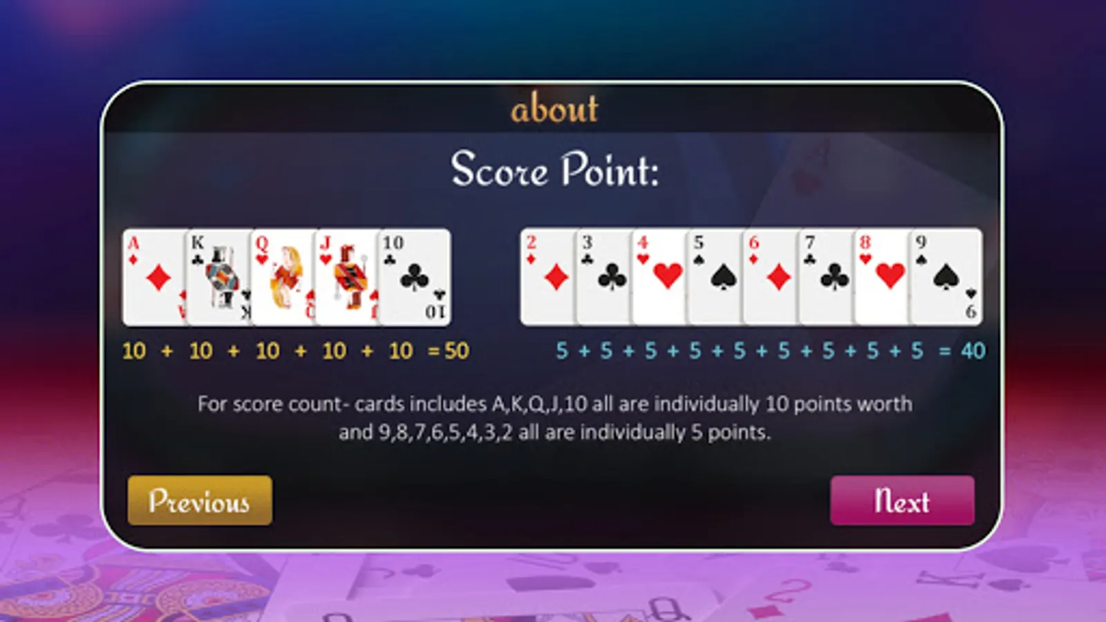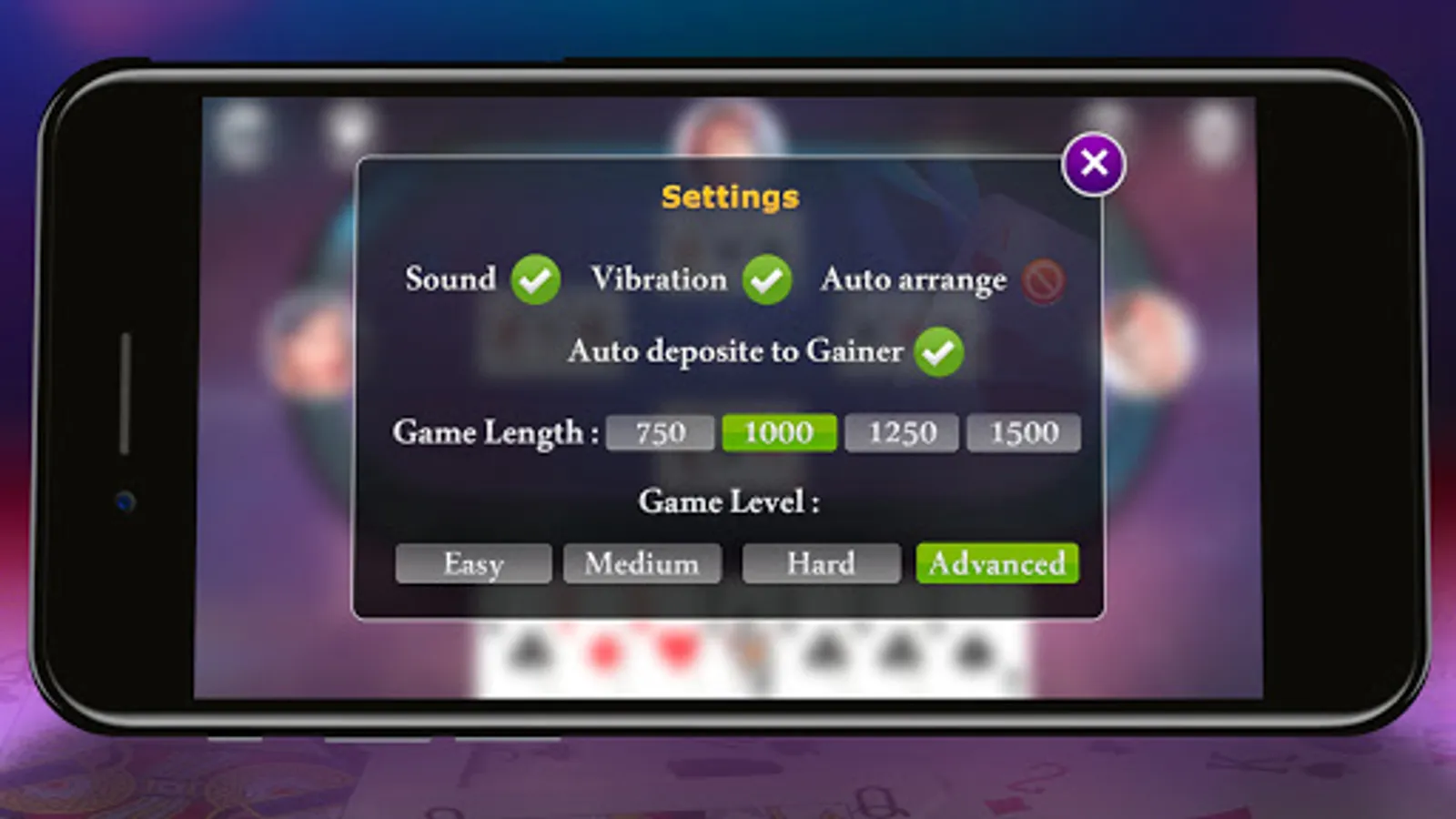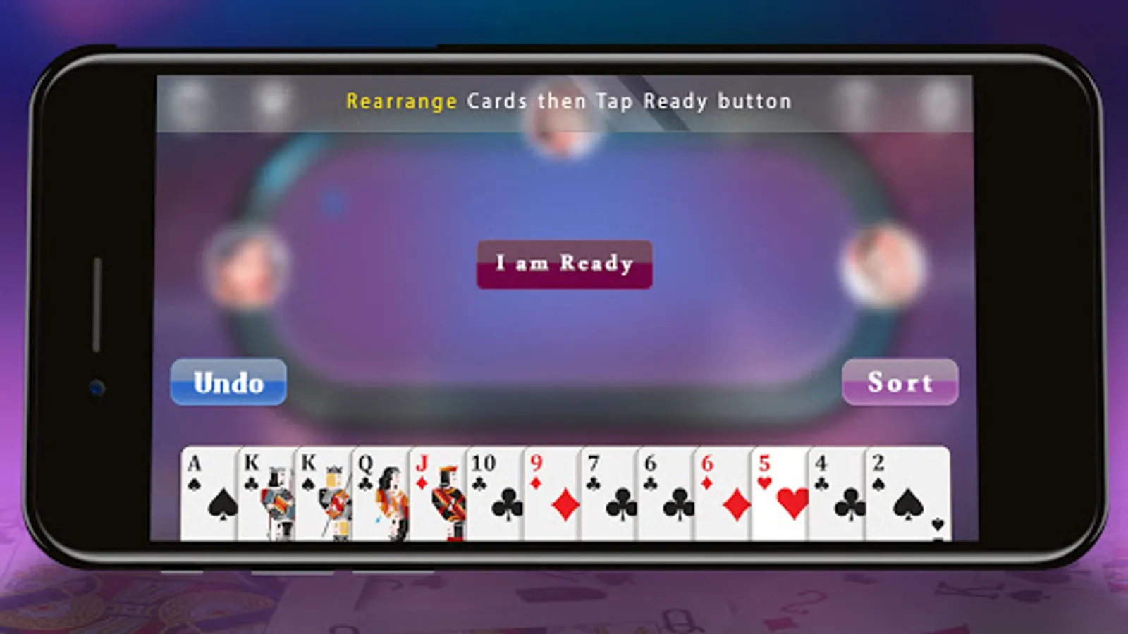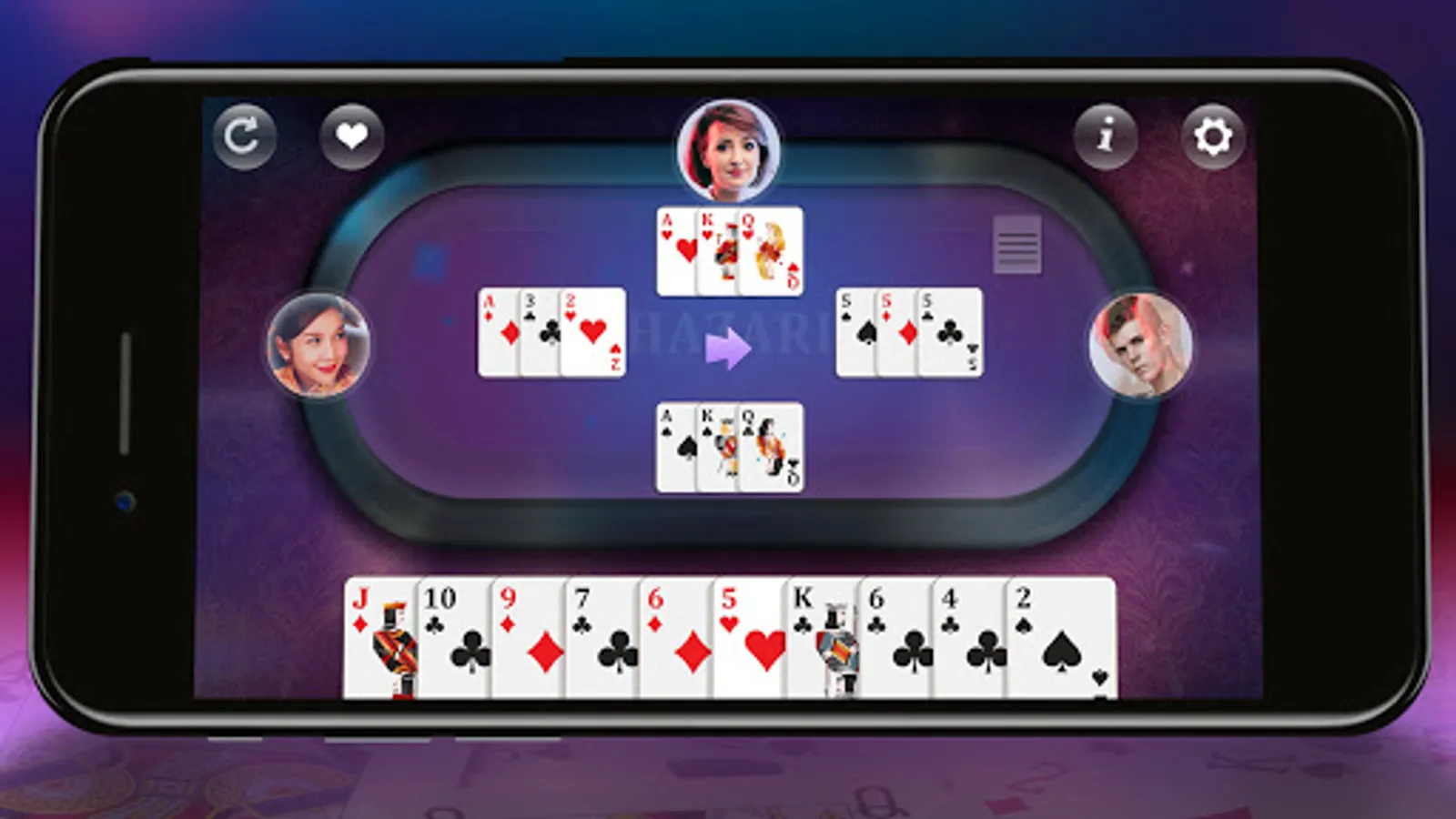 Hazari is 13 cards brag game where user arrange cards into 4 groups. Hajari is a 4 (four) players card game with a standard 52-card deck. Players get time to arrange their cards in order from higher to lower. When a player finishes his ordering or arranging his cards from Higher to Lower he Calls up. When the four players are UP, the first one from the right of the Dealer who dealt the cards starts to throw the cards. The higher card Value wins or takes all the cards and throws again the next three cards in power order. After all the cards are thrown on and taken by the winning players they are then counted, who got how much. Cards ranging from ACE (A) to 10 (ten) all are 10 points and cards from 9 to 2 all are 5 (five) points. That includes A,K,Q,J,10 all are 10 points worth and 9,8,7,6,5,4,3,2 all are 5 points. The winner is the one who has collected 1000 points all together after playing many games. If a player throws a card and the card is thrown the same by another player the second beats the first. For example, if player 1 throws AKQ of HEARTS and the second player throws 678 of SPADE and the third player throws AKQ of DIAMONDS and the fourth player throws 55J of Hearts. The winner is AKQ the third player, who takes all those cards for himself.