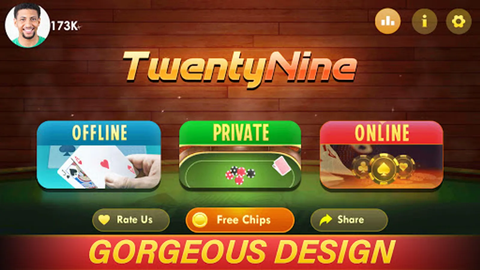 The 29 Card(Tash) game is usually played by four players dividing two teams into Two fixed partnerships, partners facing each other. 32 cards from a standard 52-card pack are used for playing this game. There are eight cards in each of the usual playing card suits: hearts, diamonds, clubs, and spades. The cards in every suit rank from high to low: J-9-A-10-K-Q-8-7. The game aims to win tricks containing valuable cards.