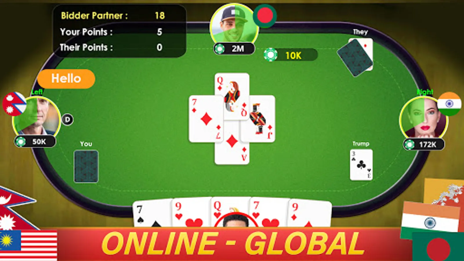 In the 29 Card game online, Deal and Play are anti-clockwise. Cards are distributed in two steps, four cards in every step. Based on the first four cards, players bid for the right to choose trumps. The normal bidding range is 16 to 28. The bid winner chooses a trump suit based on his or her four cards. The trump-card is not shown to the other players, who therefore will not know at first what suit is the trump.