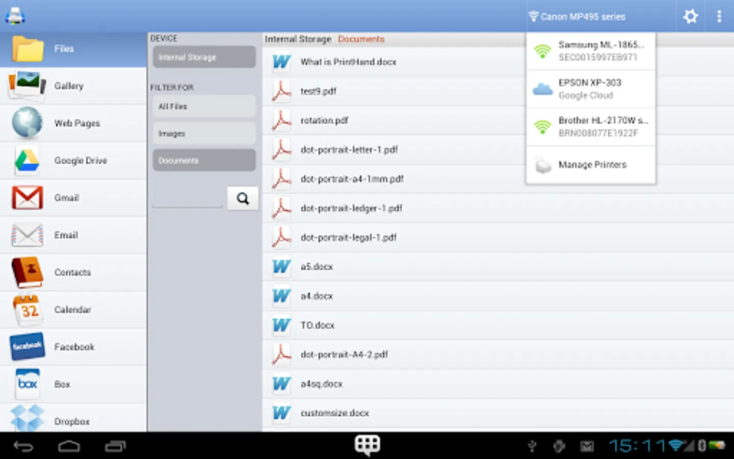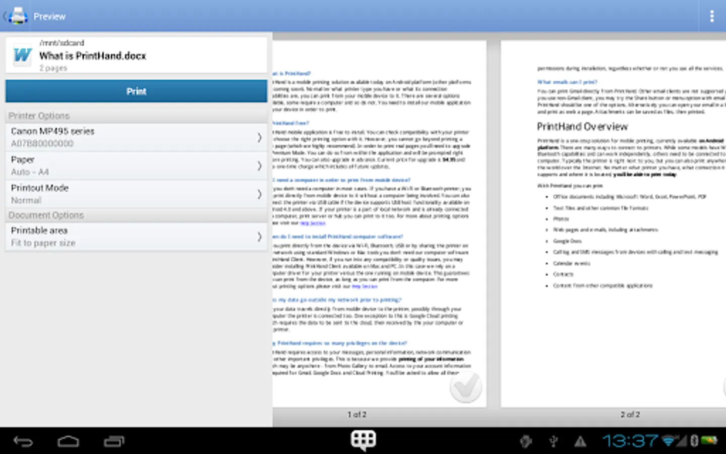 Print to Mac or Windows shared printers, Workgroup, Domain and Active Directory. Print directly via USB cable from Android 4.0 and above. Print to Google Cloud. Share the printer with our free software for Mac and PC from printhand.com, and print to any printer as long as you can print from the computer.
