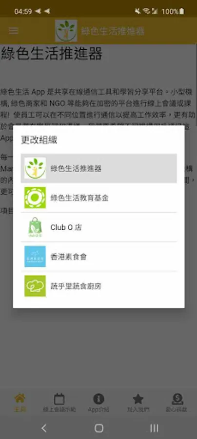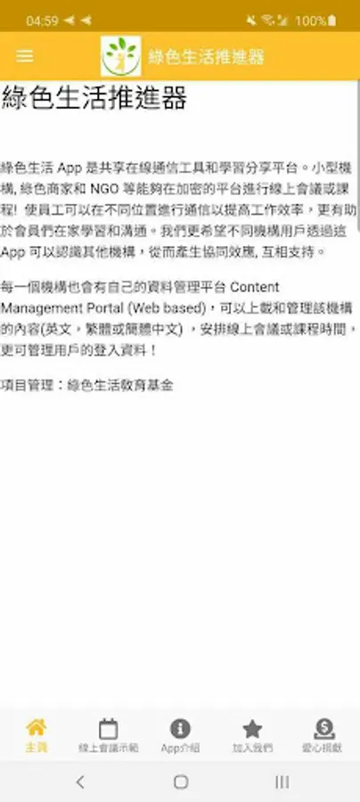 綠色生活 App 是共享在線通信工具和學習分享平台。小型機構、綠色商家和 NGO 等能夠在加密的平台進行線上會議或課程!使員工可以在不同位置進行通信以提高工作效率,更有助於會員們在家學習和溝通。我們更希望不同機構用戶透過這 App 可以認識其他機構,從而產生協同效應,互相支持。