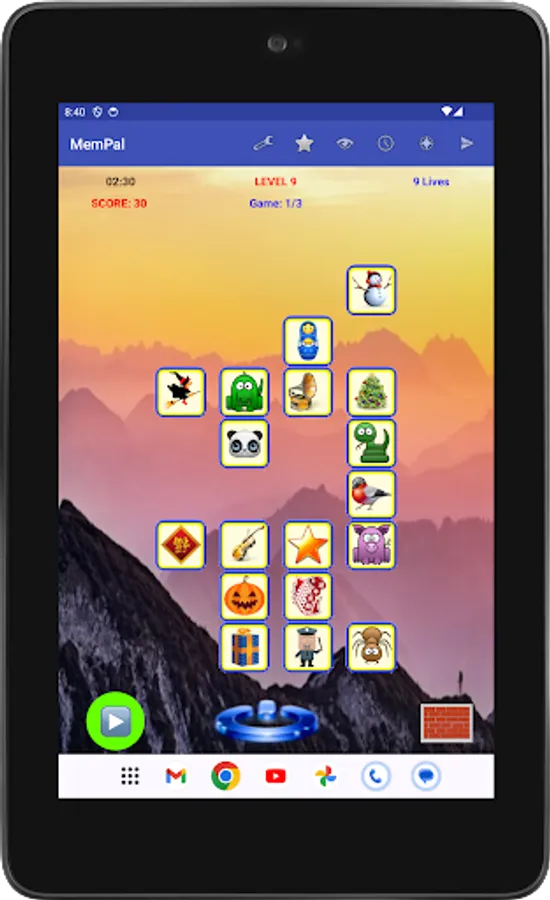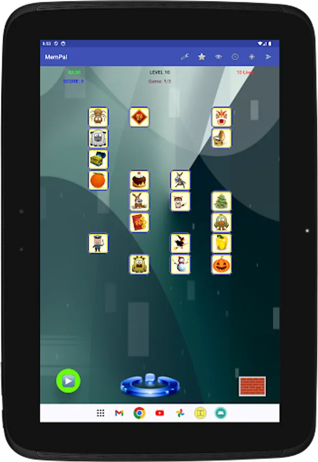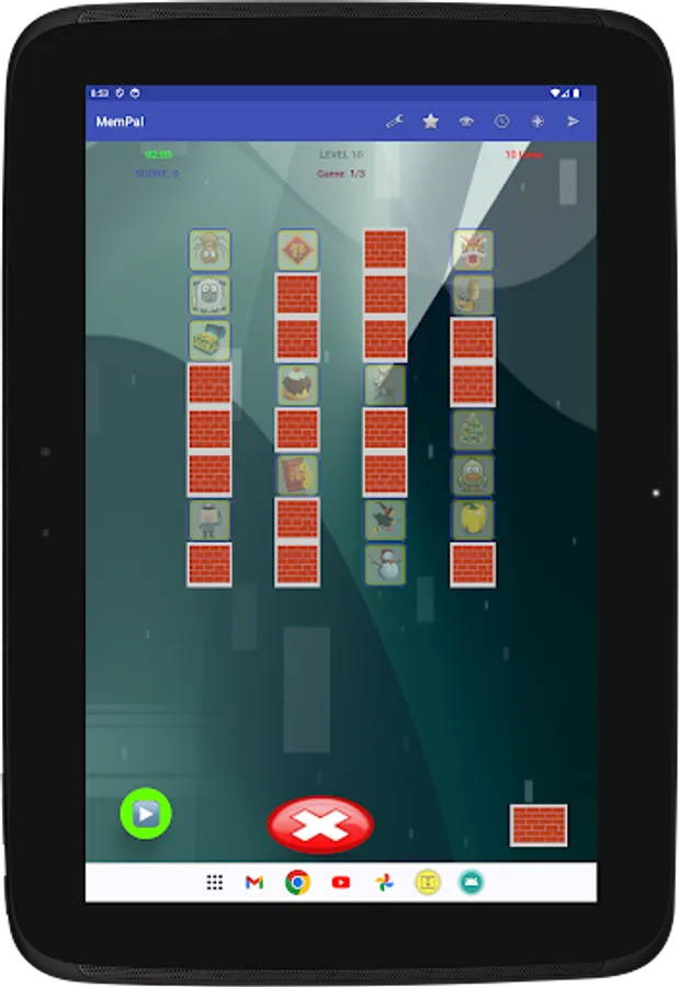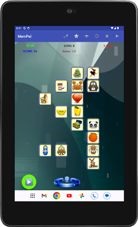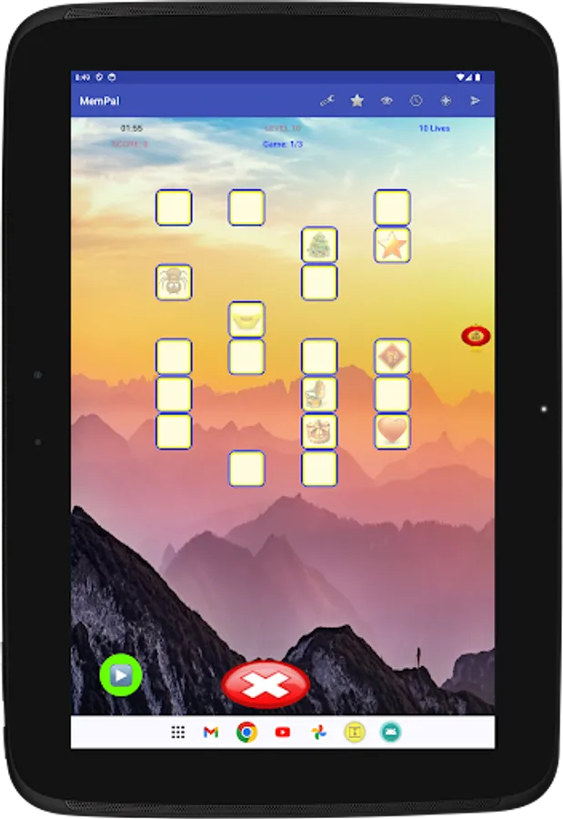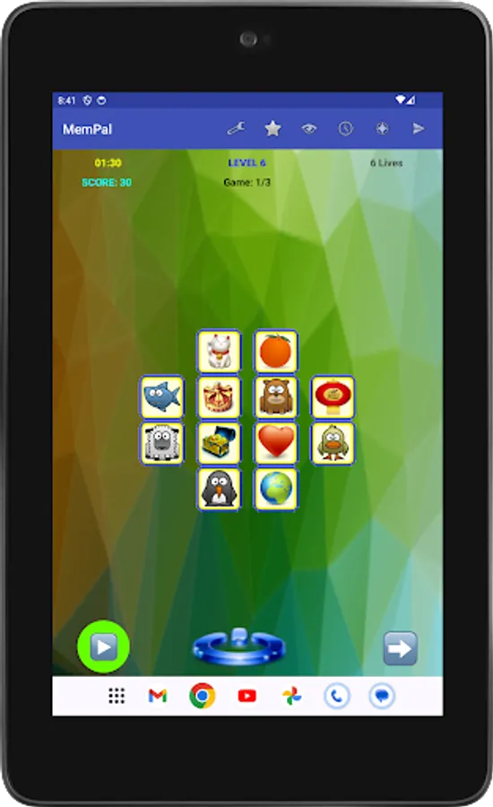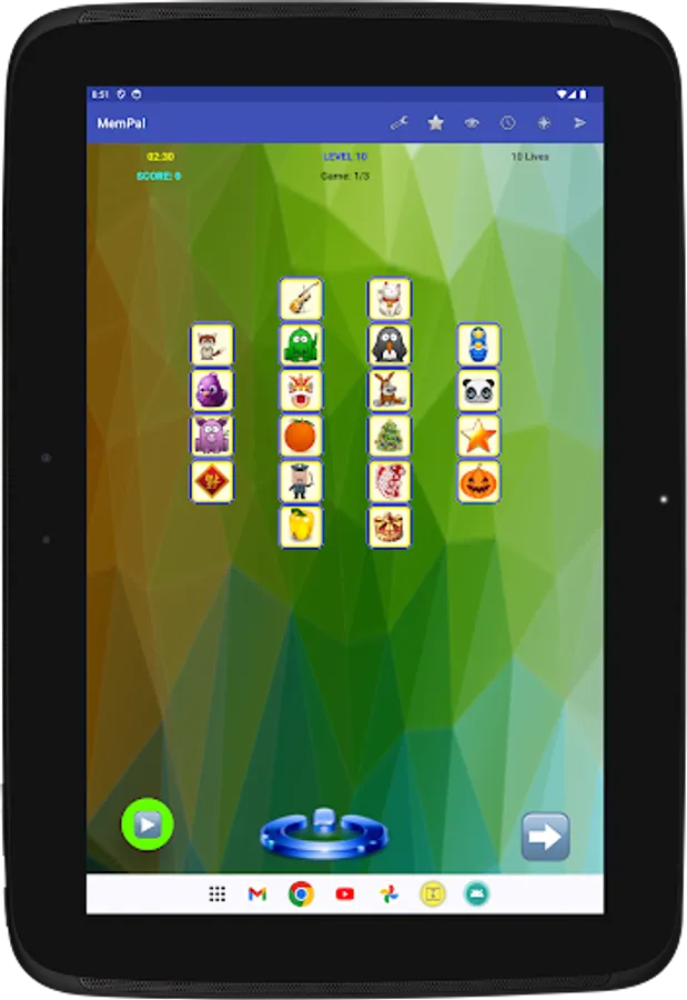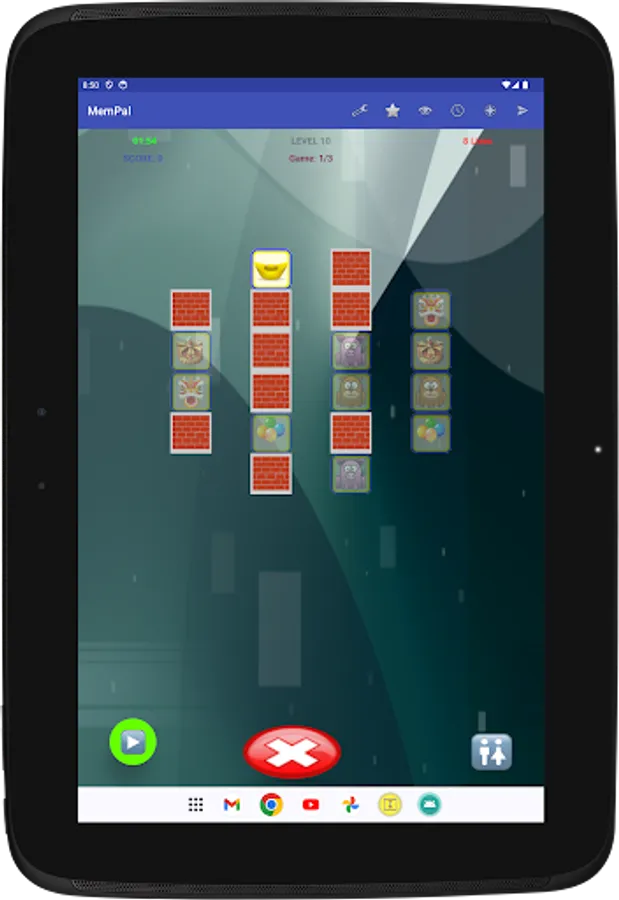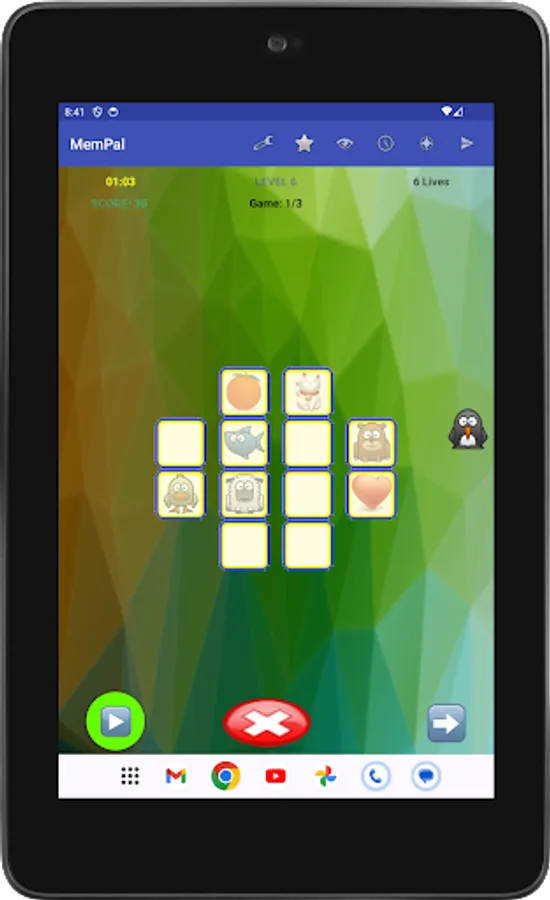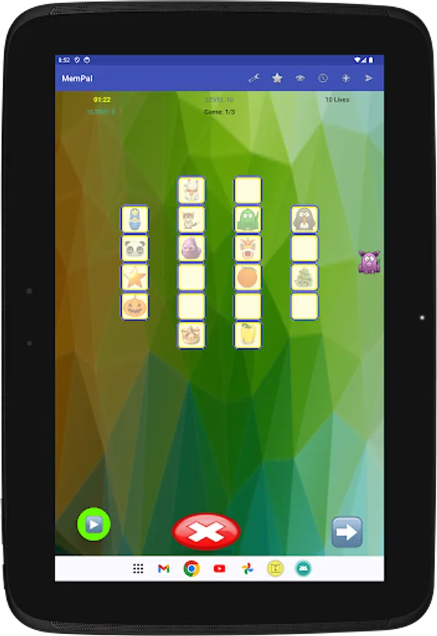 Specifically, each game presents you with a set of figures randomly assigned to tiles. To win the game, you need to remember the placement of figures on their associated tiles, and move each figure, with your finger, back to its corresponding tile, or tap a figure's tile to have the app place the figure to that tile, within the allocated time and lives for the game.