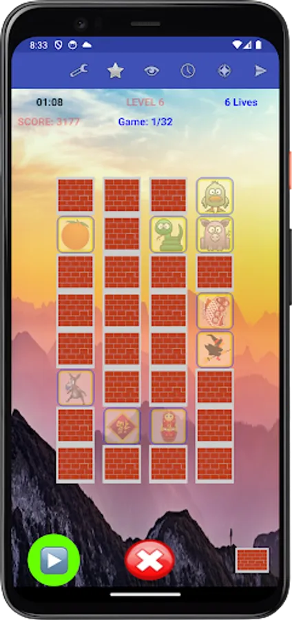 Finally, to make the games even more challenging, you may select the Challenge play mode, where you will need to place figures either one column to the right or left from their assigned tiles. or one row up or down from their associated tiles. Alternatively, you may select the Brick play mode where you will need to knock out brick tiles (instead of moving figures) to uncover all figures to win games. These new play modes will further exercise your memory and problem solving skill, and render the app even more fun to play.