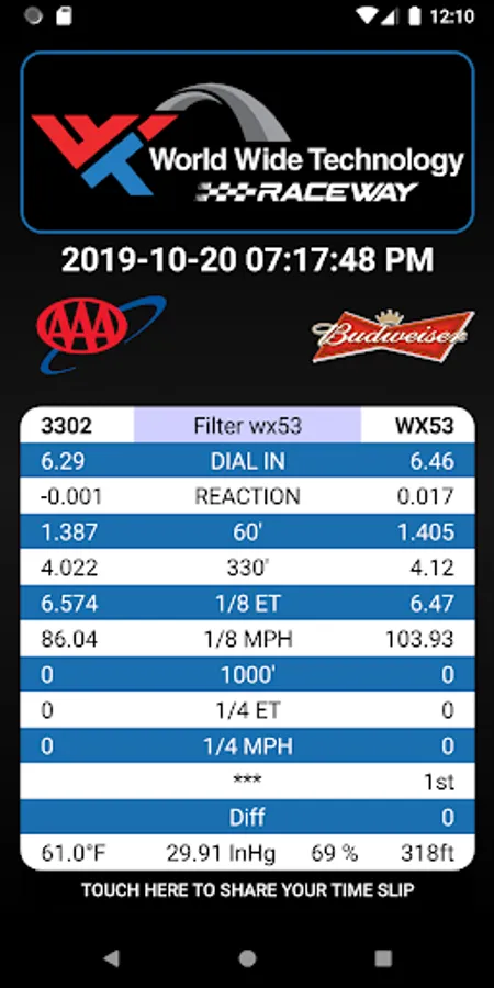 Review your drag racing time slips with our app when racing at World Wide Technology Raceway.