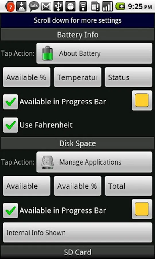 - Individually set either Battery, Disk Space, SD Card, RAM or CPU