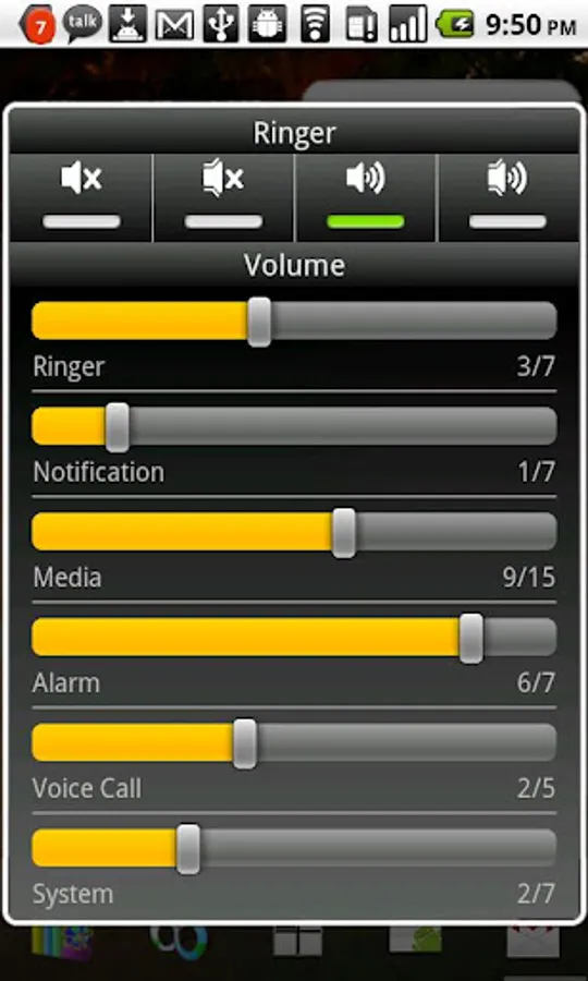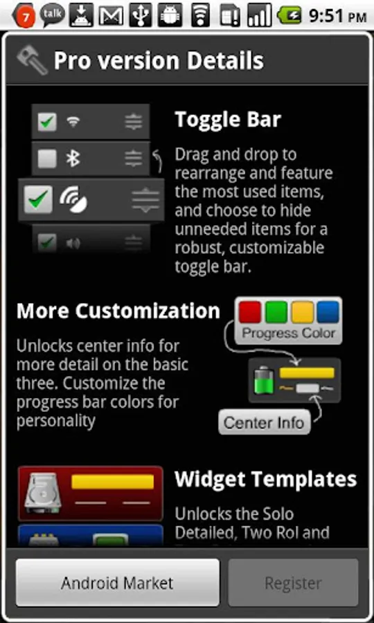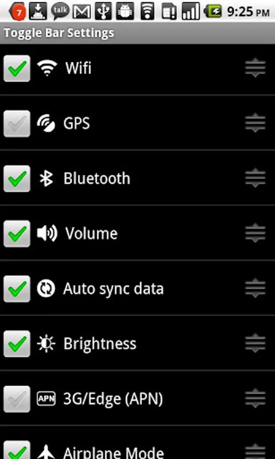 - Toggle Bar with 11 toggles: Wifi, GPS, Bluetooth (BT), Volume, Brightness, Airplane mode, Screen Timeout, APN (3G GSM EDGE), Unlock Pattern, Auto Rotation, Auto Sync