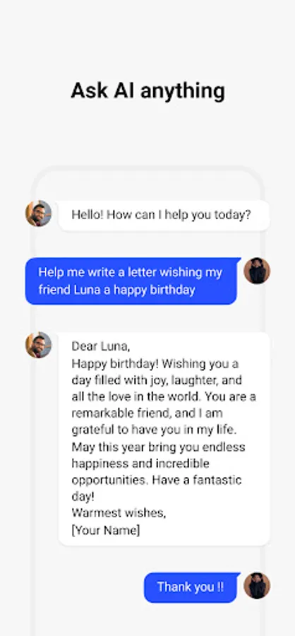 The AI chat product can help you with a wide range of scenarios, and its benefits extend far beyond just casual chatting. Our AI-powered chat function can help you write stories, write lyrics, translate, learn and enhance your education on subjects like math, science, art, and more. With our AI Chatting app, you can improve your work efficiency, and discuss topics of your interest such as movies, food, music, technology, and much more.