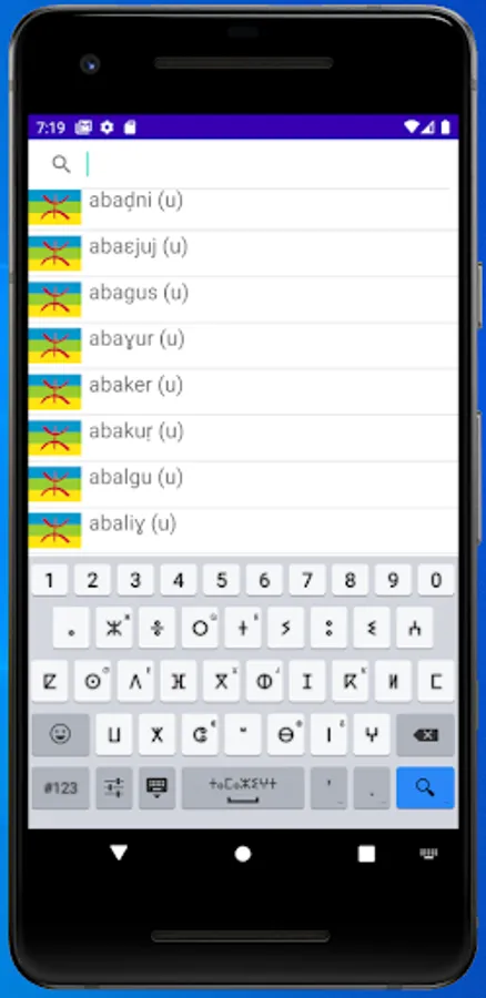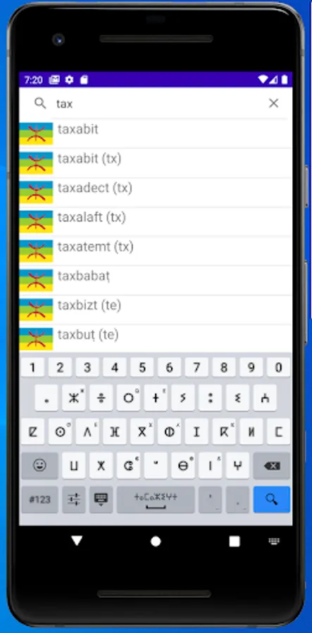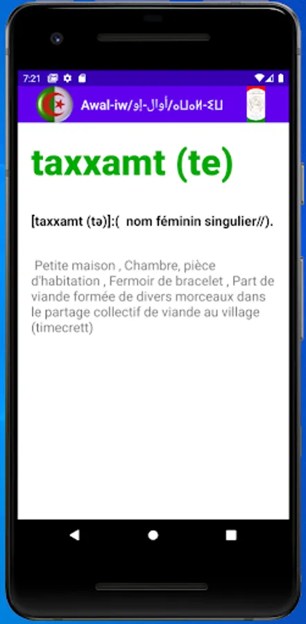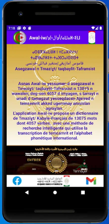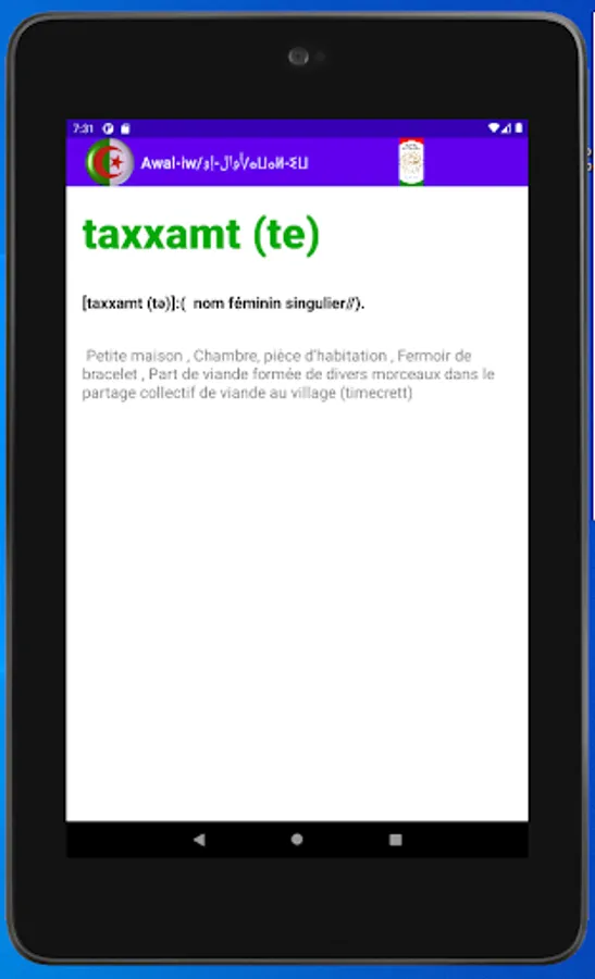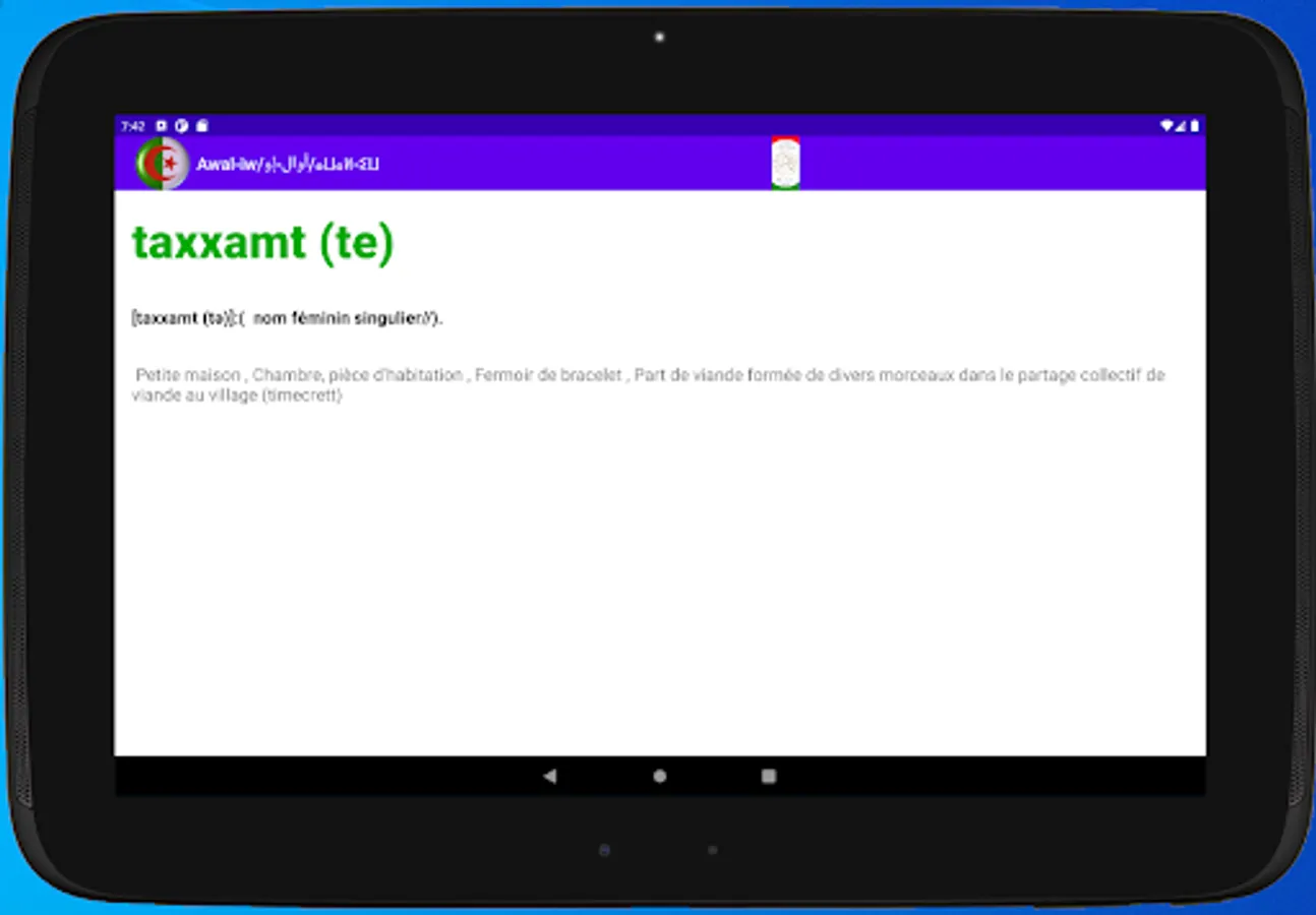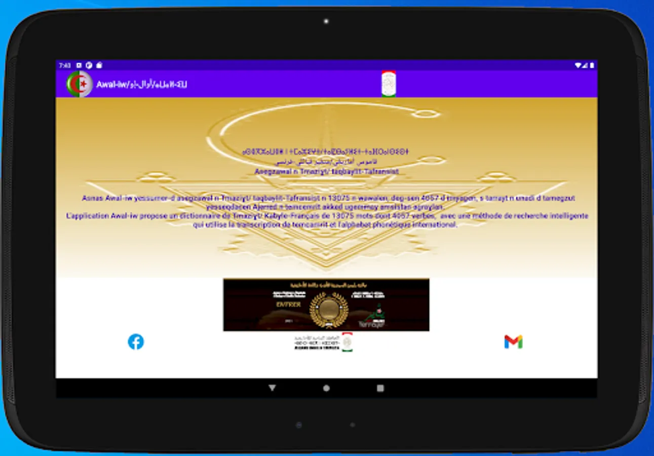 The Awal-iw application offers a Tmaziɣt / Kabyle-French dictionary of 13,075 words including 4,057 verbs, with an intelligent search method that uses the transcription of temɛamrit and the international phonetic alphabet.