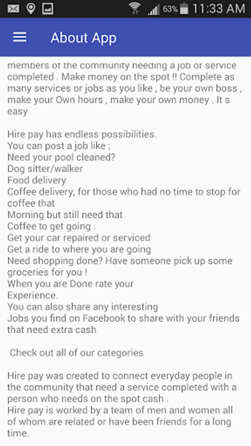 Hire pay was created to connect everyday people in the community that need a service completed with a person who needs on the spot cash.