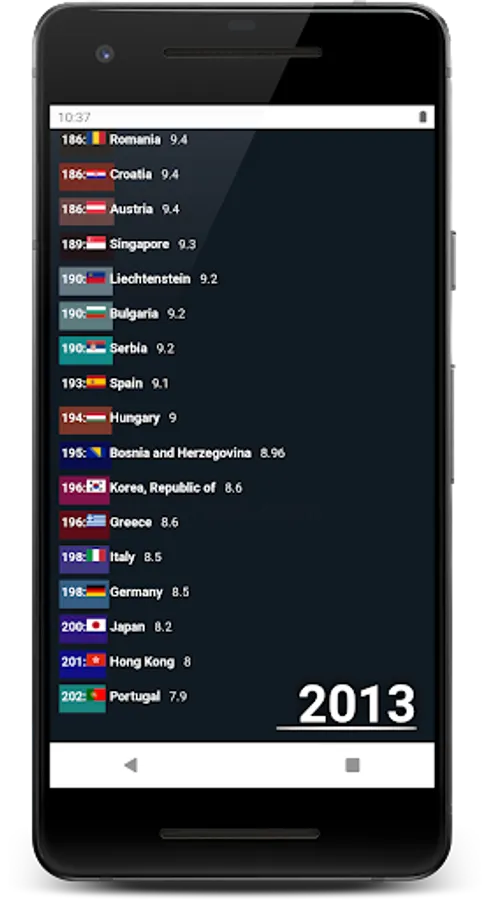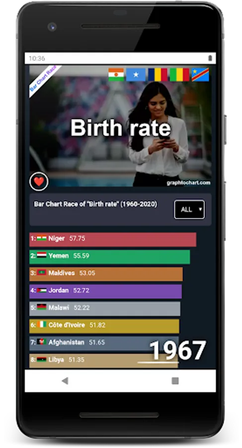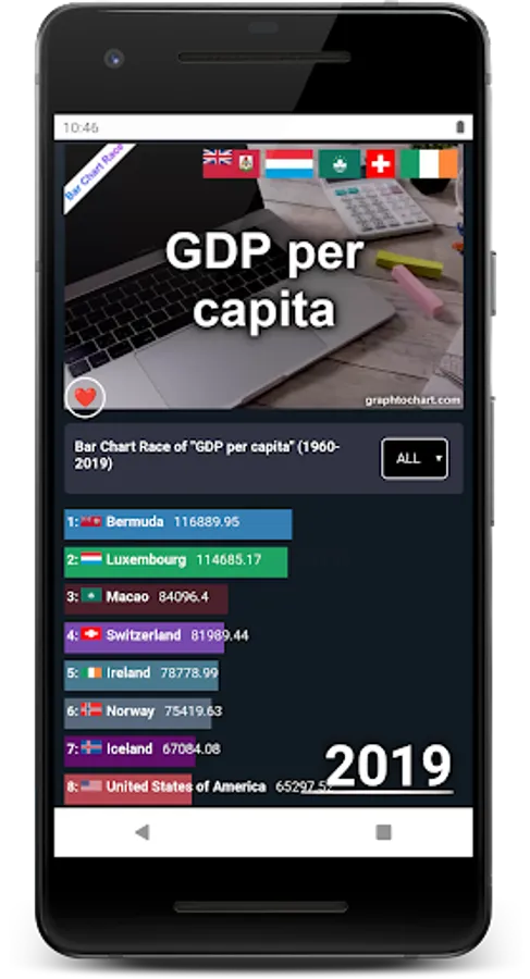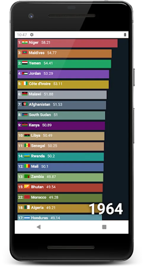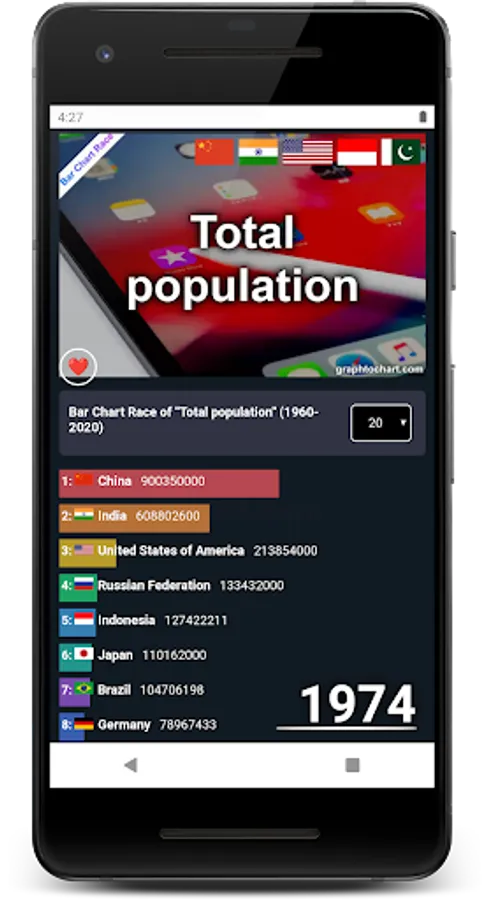 The maximum number of countries for a typical Bar Chart Race is 10, but with this app, you can choose from 20, 30, 50, 100, 200, or all of them.
