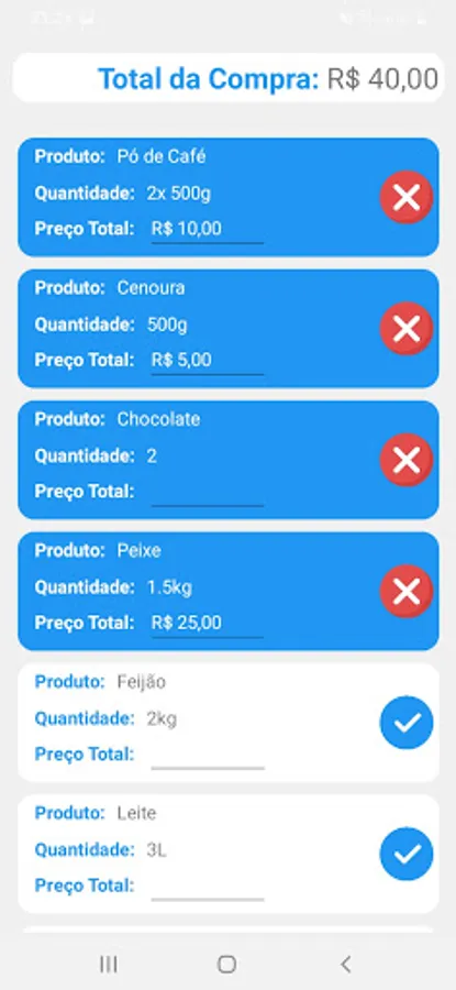 We initially made available only two interfaces, in one of which we register all the items that must be purchased, this list will be saved and can be edited. In another interface, we perform the Check-in features of the items, to ensure that nothing is missing from your cart.