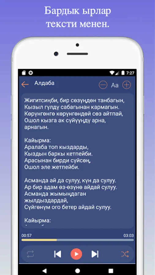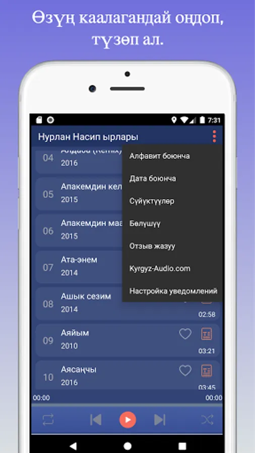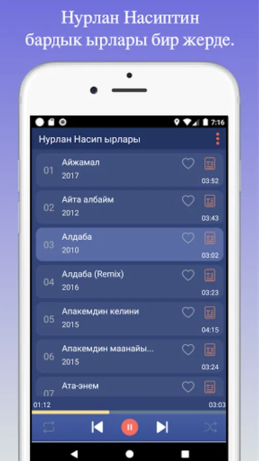 In this application you can listen to audio and read the lyrics of all songs of Nurlan Nasip. The app contains more than 80 songs.