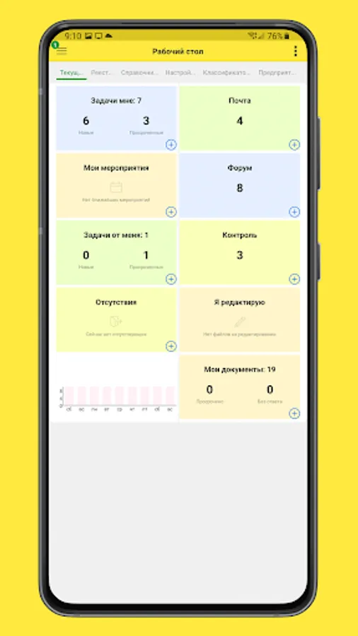 - customizable desktop (for a manager, for an ordinary employee) with convenient widgets and a mobile panel at the bottom of the screen