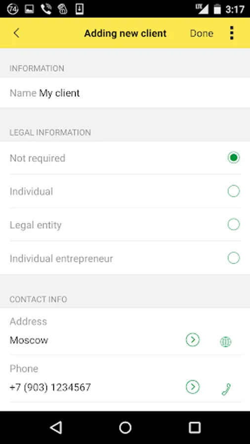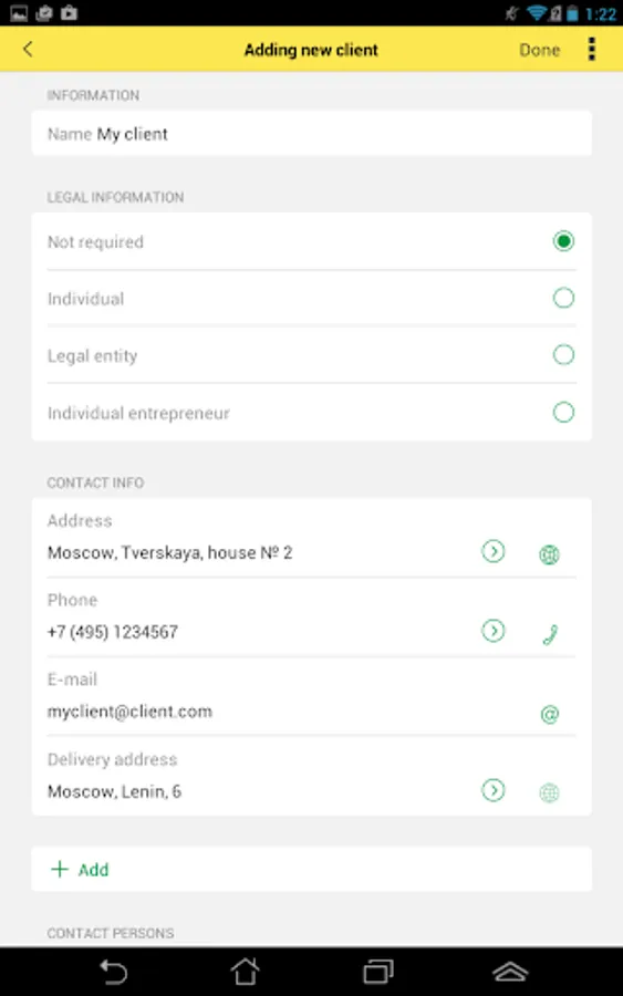 - To register clients and information on them - the name, the form of ownership; legal information, delivery conditions (time, address), contact information (name, address, phone, email);