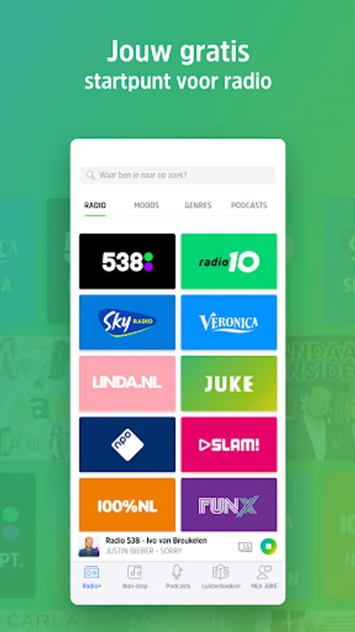 From Radio 538 to Radio 2 and from RTV Rijnmond to Omroep Brabant. From De 538 Ochtend with Wietze and Klaas to Ekdom in the Morning. And don't miss a second of a sports game with live game commentary via Ajax Radio, AZ Radio, and Grand Prix Radio. The most comprehensive offering in one place with: