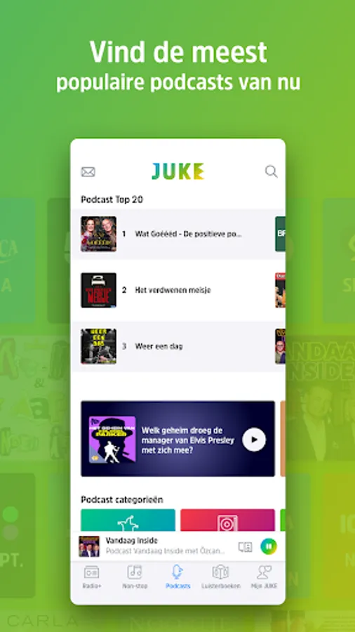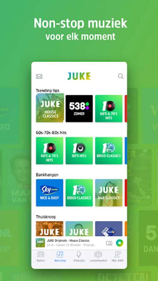 Listen wherever you are? Welcome to JUKE! Discover the most popular and newest podcasts that you want to listen to today. Start an exciting audiobook on your way to work. Easily switch between all your favorite radio stations. Turn on a non-stop music channel for every mood or moment. And be surprised by the suggestions from our editorial team. At work, at home, at the gym, or on the go.