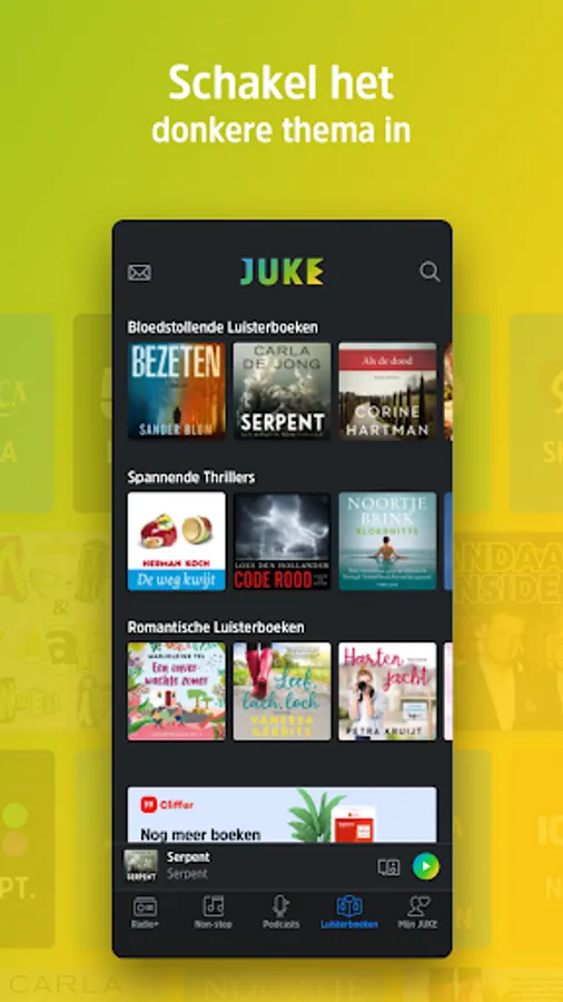 Listen to unlimited books in all genres. On the edge of your seat with a thrilling thriller or dream away with a romantic novel. Experience it with a free audiobook. Find the best audiobook for your commute to work, during cleaning, while walking the dog, or just in bed at JUKE... With a wide selection of audiobooks in all genres, there is always something new to discover: