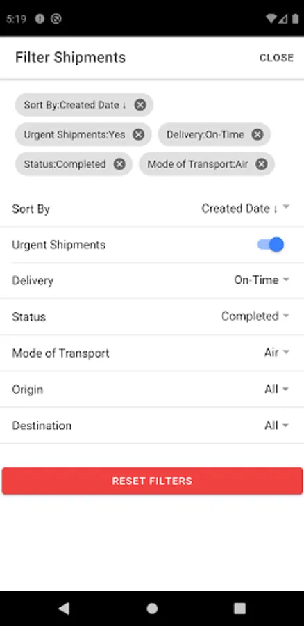 - Shipment summary information including status, origin and destination, completion rate, current activity, mode of transportation, and estimated time of arrival