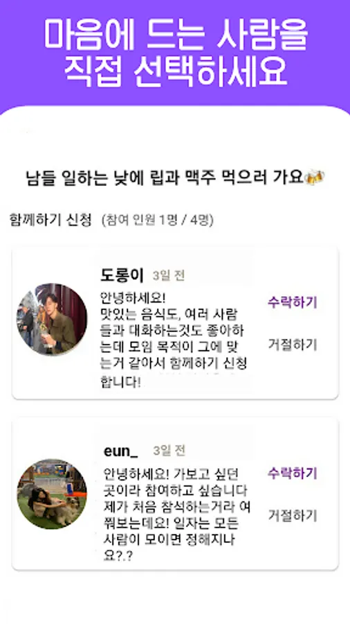 -I read the reasons and profiles of applicants, and reviews of people I met before, and I choose the person I want to join with.