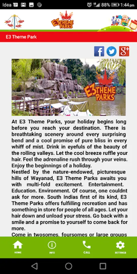 Nestled by the nature-endowed, picturesque hills of Wayanad, E3 Theme Parks awaits you with multi-fold excitement. Entertainment. Education. Environment. Of course, one couldn’t ask for more. South India’s first of its kind, E3 Theme Parks offers fulfilling recreation and has something in store for people of all ages. Let your hair down and unload your stress. Go back with a smile and a promise to yourself to come back for more...