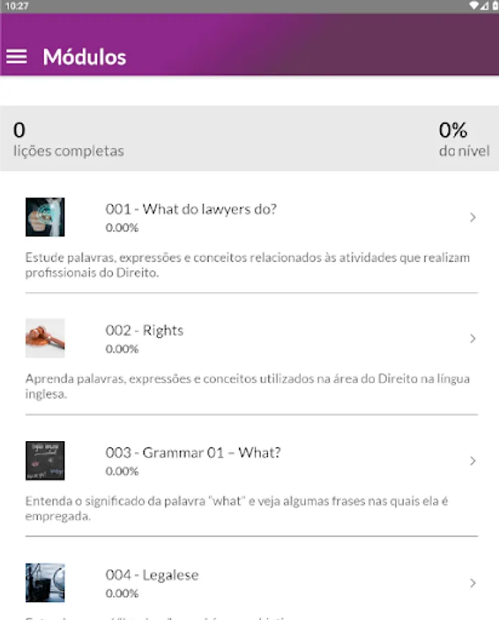 The activities of E4L – English for Lawyers were developed by specialists in the English language in partnership with specialists in the area of Law. Therefore, the user of E4L – English for Lawyers studies the English language in a contextualized way, seeing and reviewing important concepts and terms for a legal professional.