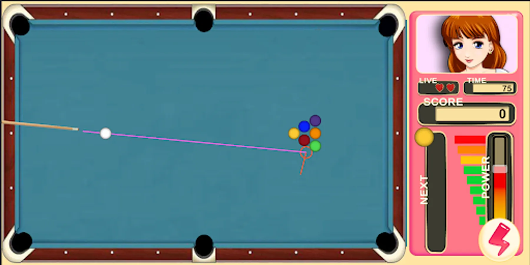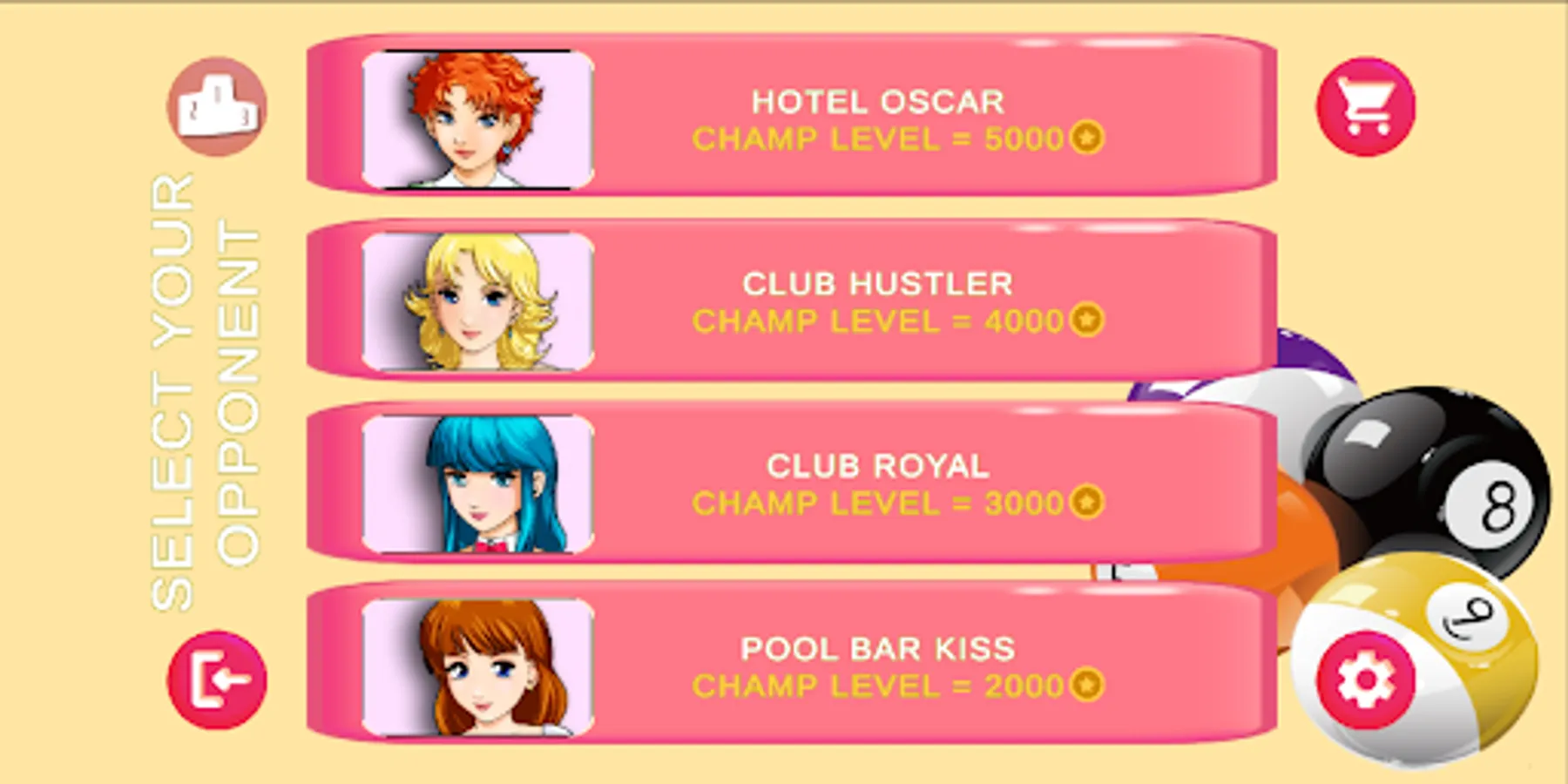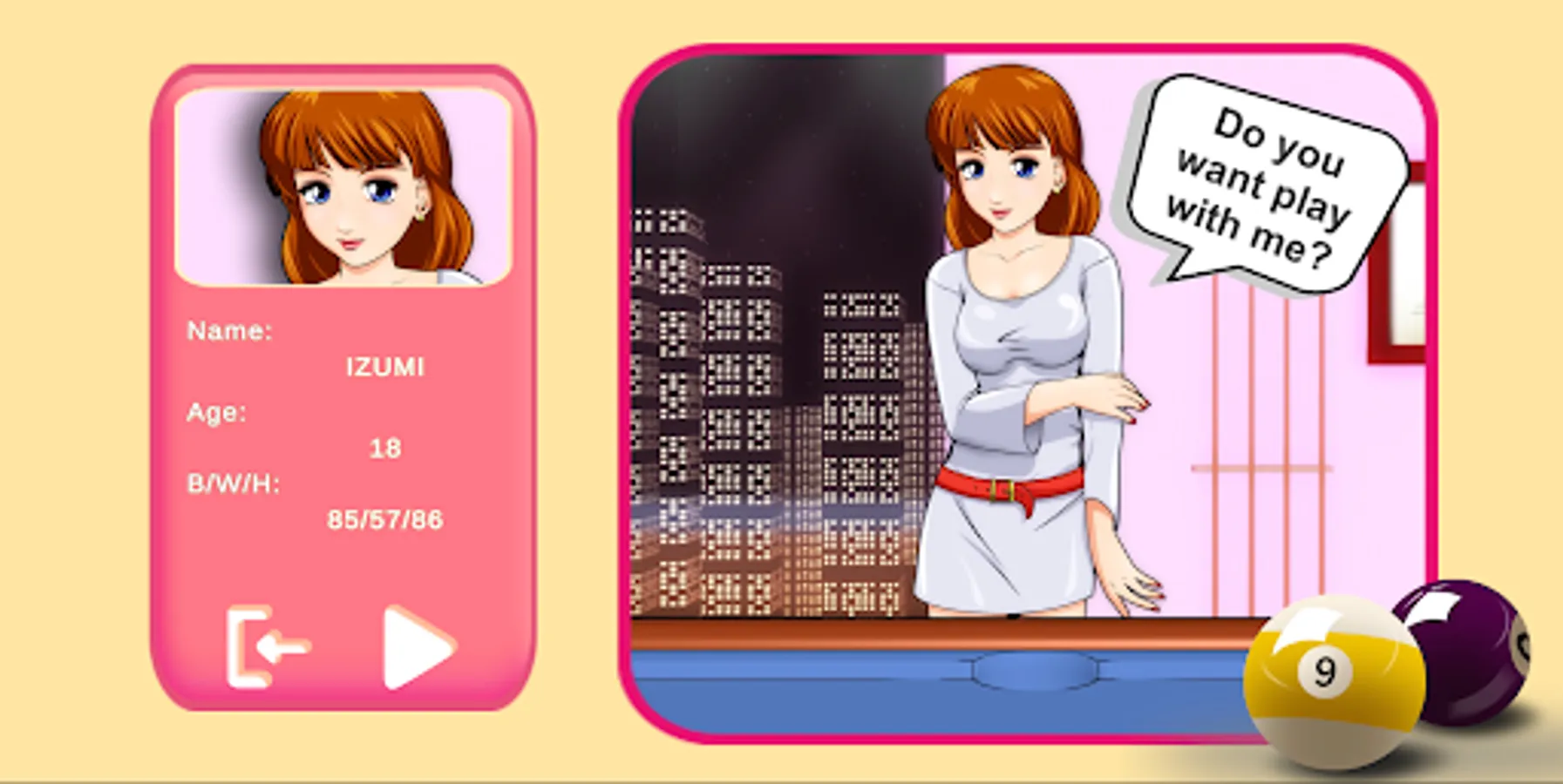 A pool game with four levels, each denoted by a different woman. Score enough points to win and advance you to the next level.