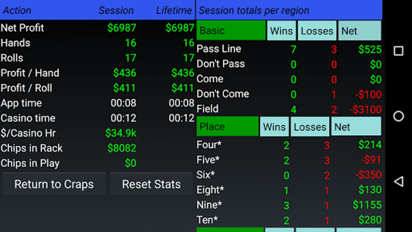 The game statistics tell you how much you are winning or losing on every roll, every hand, and every simulated casino hour.