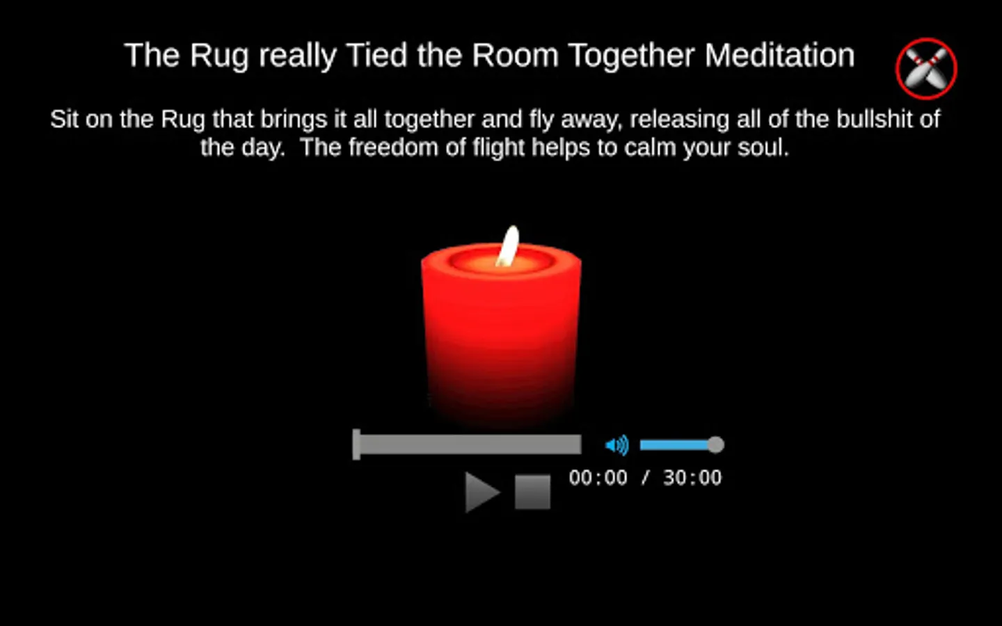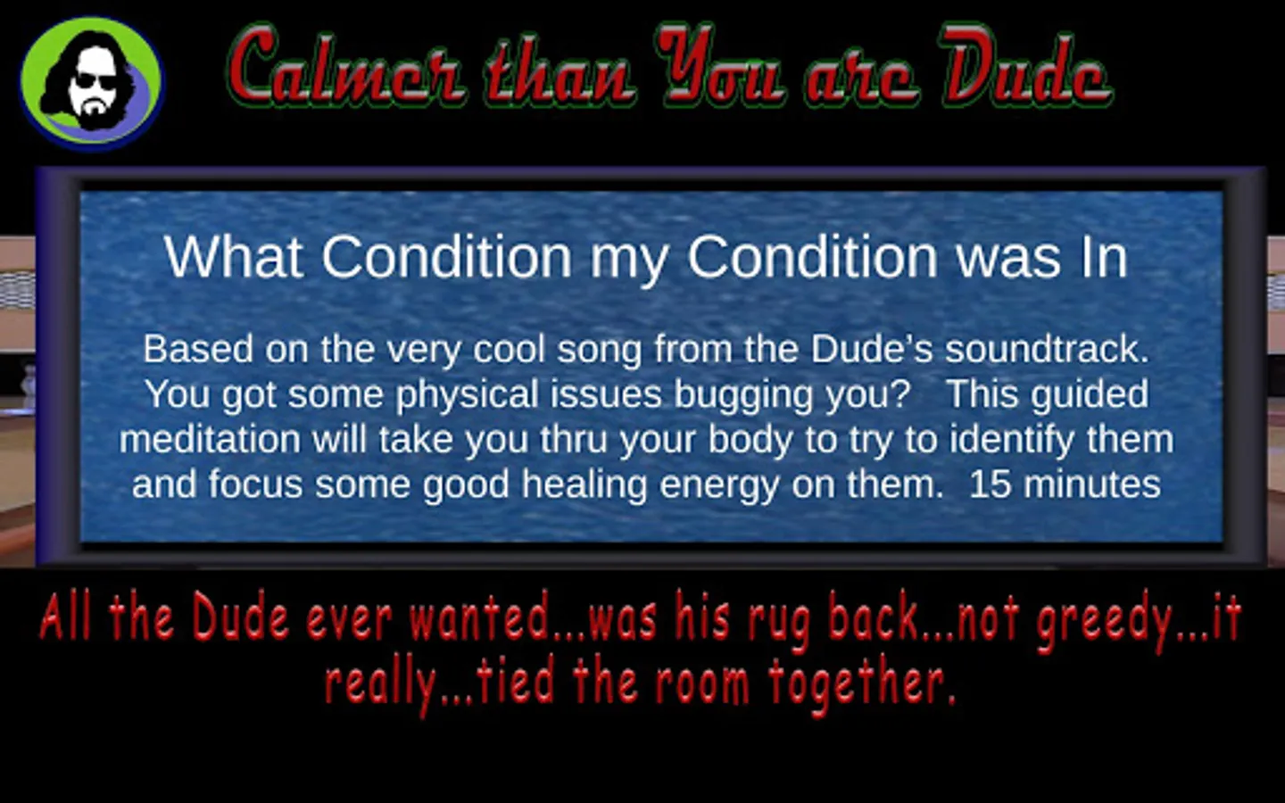 These meditations were written, recorded, and blessed by an ordained minister of Dudeism. Ok, blessed might be a bit much, but know that they are in the spirit of Dudeism and give you a nice escape from the Nihilists and Rug pee-ers of the world.
