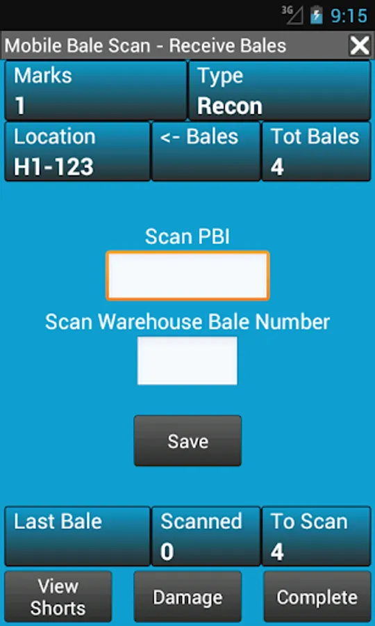 - Select an inbound mark to work with (from a list or scanned from a barcode), then match up PBI numbers with warehouse bale numbers. Even record damaged bales if you like, which can send an email with attached photo of the damaged bale. For certificated bales, bale weight can be captured from a scale via bluetooth. When complete, data is uploaded to your eCotton Warehouse System wirelessly...no docking of the device or scanner in the office, and no chance of losing a day's worth of work.